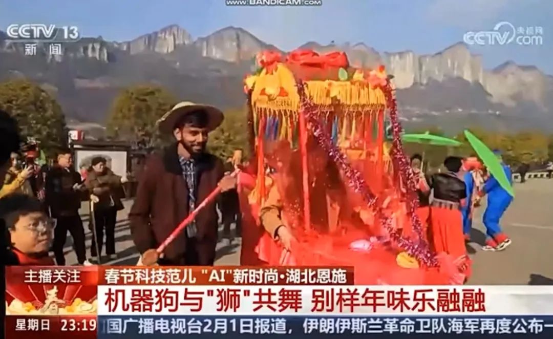恩施大峽谷景區,舞獅、劃彩龍船、擺手舞、土司老爺祈福等傳統民俗表演輪番上演,精彩紛呈。土家幺妹兒智能機器人“小青”大秀才藝,與游客親密互動,體驗科技與傳統文化的完美融合。機器狗身著新春定制服裝,為游客獻上歡快舞蹈,讓游客們在歡笑中感受到了濃濃的年味。