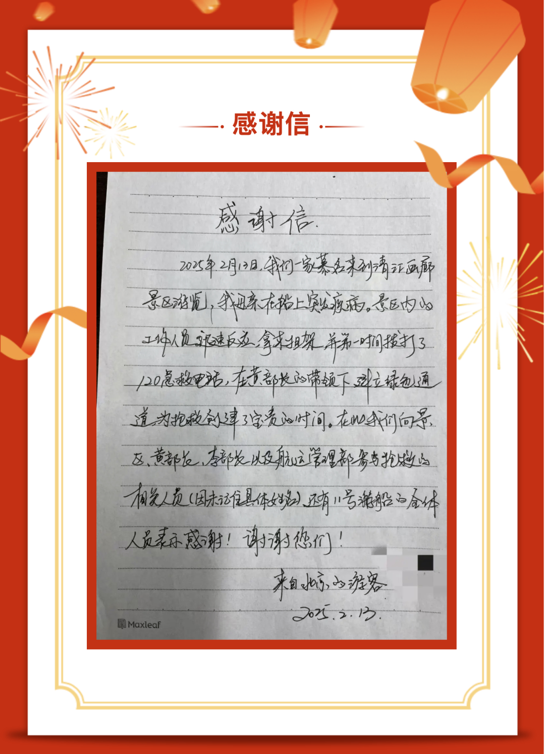 緊急救援為患者爭取了寶貴的救治時間。隨后,景區工作人員了解到,楊女士母親送醫及時,目前病情已趨于穩定。當天,楊女士手寫了一封感謝信,表達對景區工作人員的高度認可和謝意。