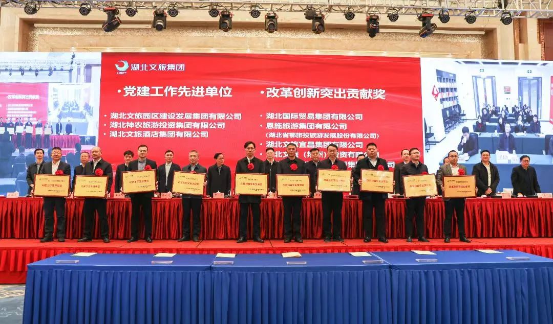 在湖北文旅集團2025年工作會暨黨建紀檢會議上,神旅集團榮獲“黨建工作先進單位”,黨委書記、董事長孫俊(左二)上臺領獎