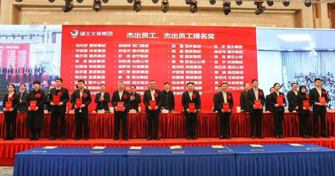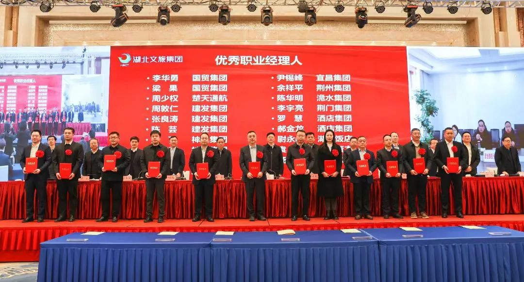 在湖北文旅集團2025年工作會暨黨建紀檢會議上,望飛(左七)、吳艷麗(左八)榮獲“優秀職業經理人”稱號