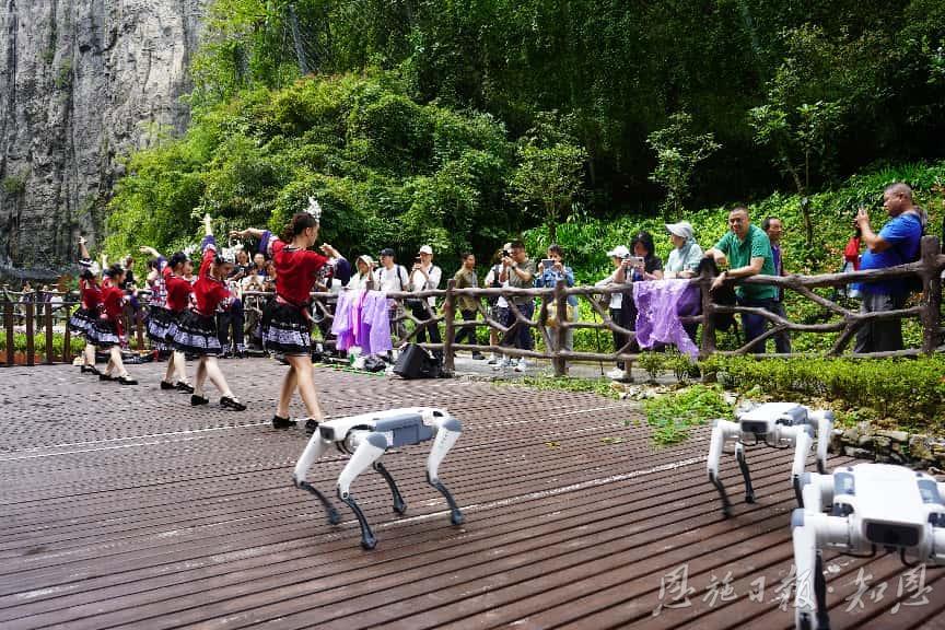 在景區迎客松處,旅行商們熱情打卡,合影留念,“清江升白云”的奇景讓大家宛如置身仙境。在“一炷香”前,旅行商們贊嘆大自然的鬼斧神工。熱情奔放的土家族擺手舞與悠揚民歌交織,讓嘉賓們沉浸其中、流連忘返。景區內,機器狗跳起舞蹈,外骨骼裝備整裝待發,無人機帶飛的VR視野將峽谷全貌盡收眼底,讓大家以“上帝視角”飽覽大峽谷的雄奇壯美。