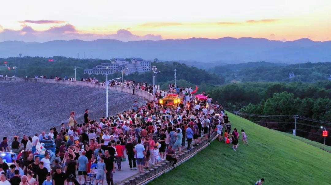 隨著夜幕低垂,大壩兩旁的燈光逐一亮起,將四周點綴得流光溢彩。人群聚集在大壩之上,熙熙攘攘,氣氛熱烈。活力四射的歌聲、誘人的美食、有趣的娛樂設施以及熱情的民俗表演,共同構成了一場夜游盛宴,讓整個夜晚的氛圍逐漸升溫。